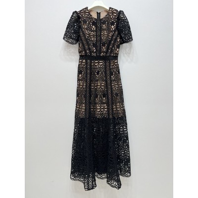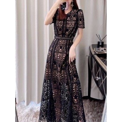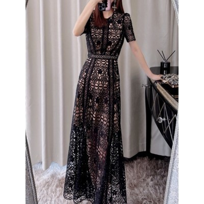 الرئيسية > vestir > Extrañar > 2022 FallWinter New Round Neck Black Faux Hand Crochet Lace Floral Embroidery High Waist Women Casu(